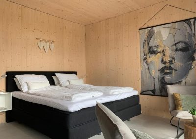 Onze ruime tweepersoonskamer is gelegen op de begane grond en beschikt over een eigen badkamer met inloopdouche, wastafel en toilet. De kamer is voorzien van een comfortabel kingsize bed van 210 cm lengte, vloerverwarming en ventilatie voor een aangenaam binnenklimaat.